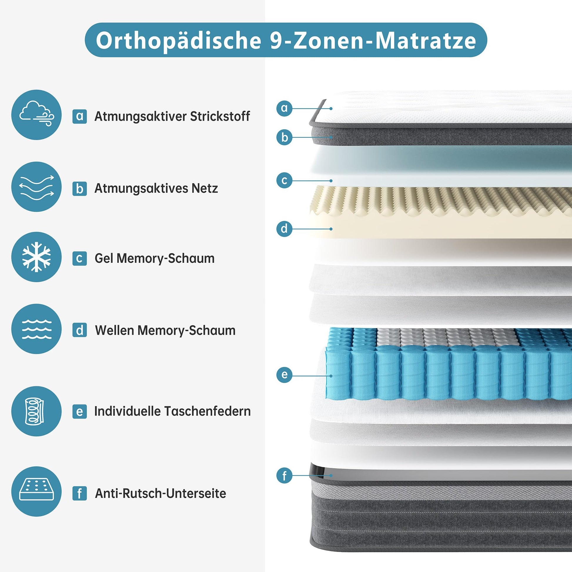 - 🌟【Ergonomisch & Druckentlastend】TeQsli 9-Zonen Matratze 140x200 cm kombiniert Gel-Memory-Schaum und Taschenfedern für perfekte Anpassung an Ihre Körperkonturen. Optimale Unterstützung und Druckentlastung helfen, Rückenschmerzen zu vermeiden. Genießen Sie eine erholsame Nacht!